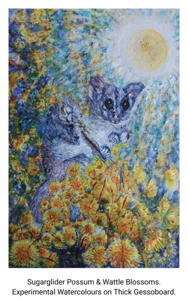 Under the full luminous night of the full moon, the tiny Sugar Glider Possum reaches out from the safety of the interwoven branches of her familiar blossom laden tree…..